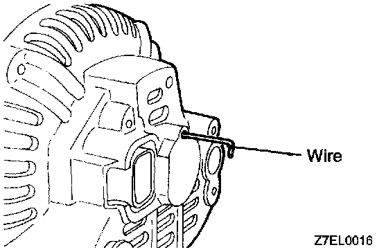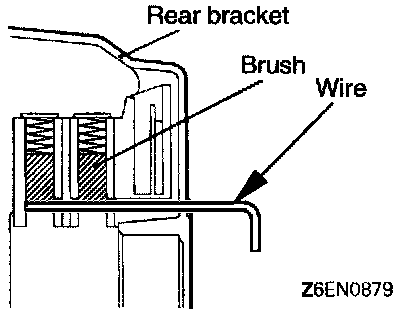 is attached to rear bracket, insert wire through small hole made in rear bracket to lift brush. After rotor has been installed, remove the wire.
