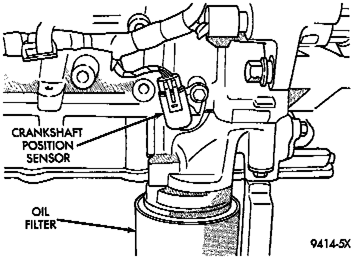 The crankshaft position sensor attaches to the cowl side of the engine block. It is located between the main bearing cap/bed plate assembly and block behind the power steering pump Fig. 7.