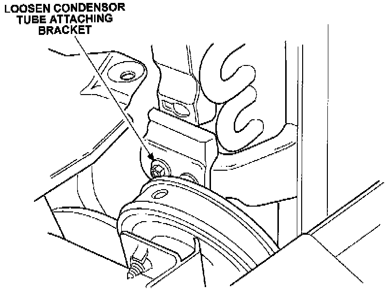 13. Loosen A/C condenser tube attaching bracket on right side edge of radiator.