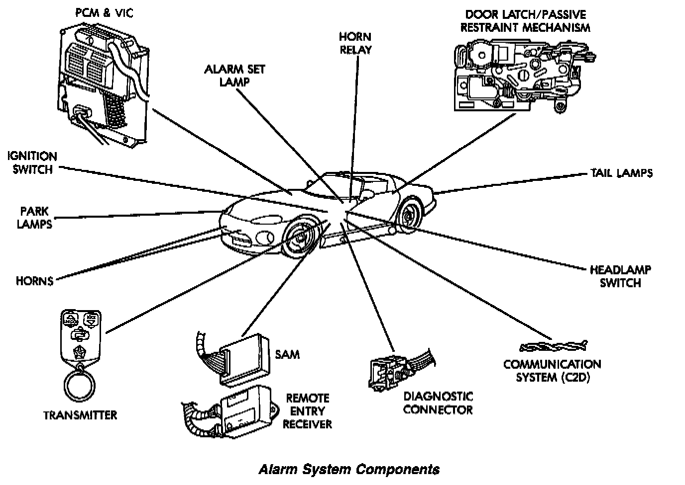 This passive system is designed to protect against vehicle theft. The system monitors vehicle doors, interior lamps and ignition action for unauthorized operation. The alarm activates by sounding the horn, flashing the park and tail lamps and providing an engine kill feature.