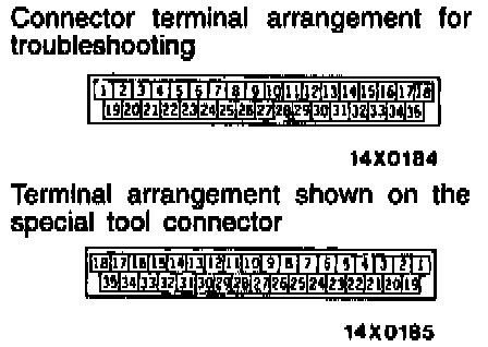 2. The ABS-ECU connector terminal arrangement for troubleshooting is different from that on the special tool connector. So take the readings from the terminal numbers of the special tool when checking.