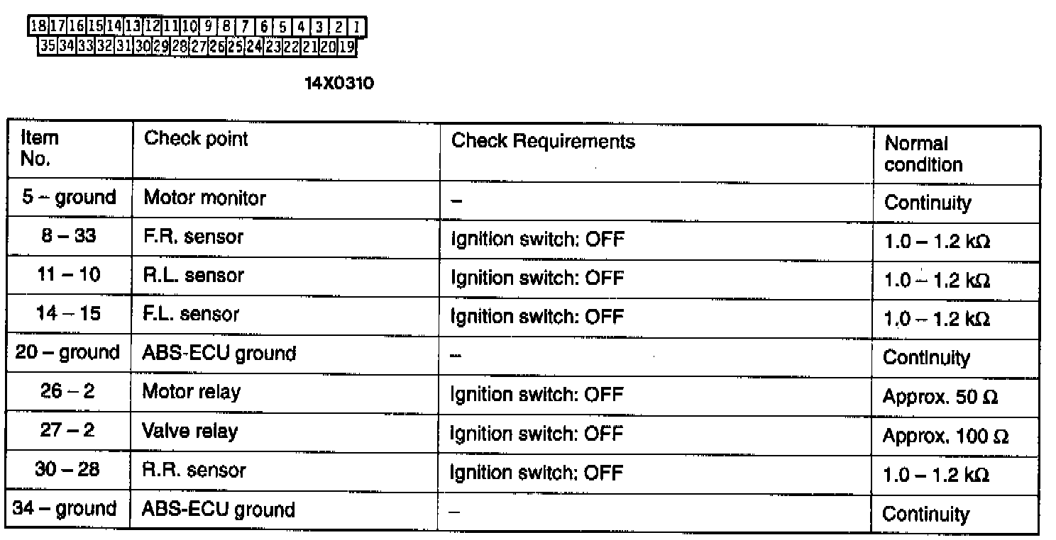 CAUTION: If resistance or continuity checks are performed on the wrong terminals, damage to the vehicle wiring, sensors, ABS-ECU, and/or ohmmeter may occur. Use care to prevent this!