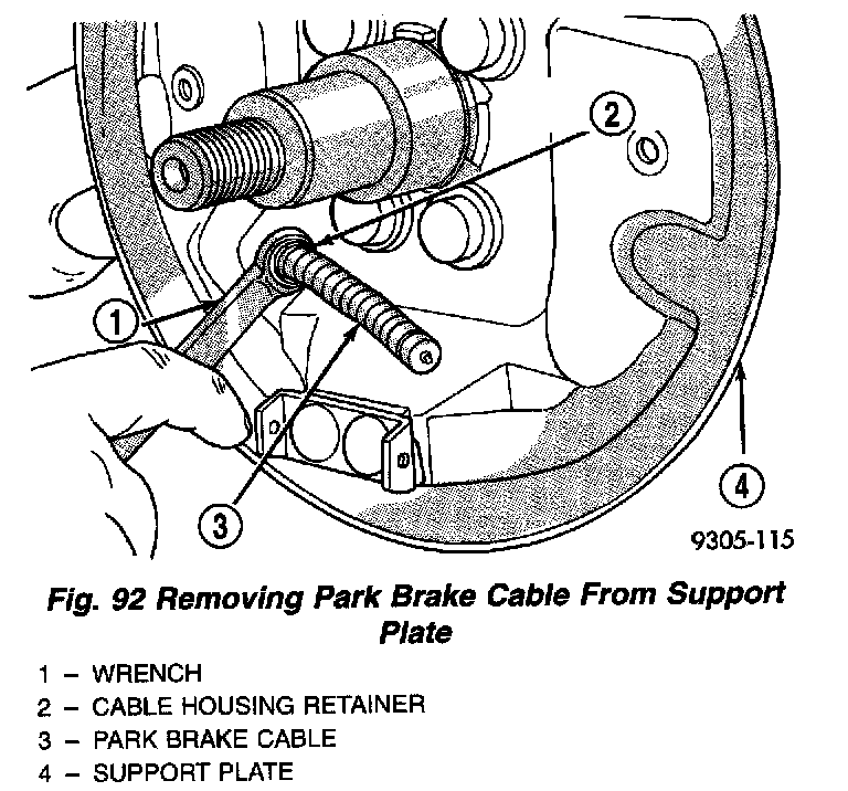 6. Position a 1/2 box wrench over the retainer fingers on the end of the parking brake cable. Compress cable housing retaining fingers and start housing out of support plate. Remove wrench when retainer is free from the park brake cable mounting hole in the rear brake support plate. Alternate method is to use a aircraft type hose clamp over cable housing end fitting compressing the three fingers.