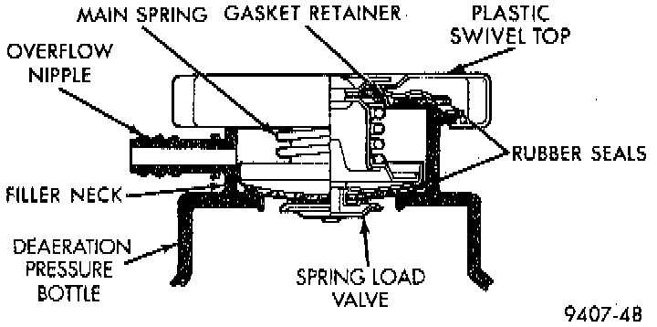 Remove the pressure tester hold the cap in hand, right side up. The vent valve at the bottom of the cap should not open. If the rubber gasket has swollen and prevents the valve from closing, replace the cap. Hold the cleaned cap in hand upside down. If any light can be seen between vent valve and rubber gasket, replace cap.