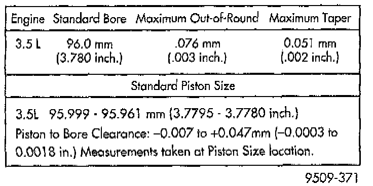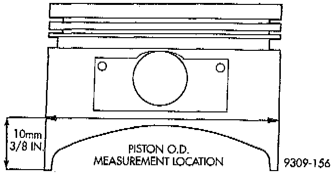 Piston and cylinder wall must be clean and dry. Piston diameter should be measured 90 degrees to piston pin at size location shown in the illustration. Cylinder bores should be measured halfway down the cylinder bore and transverse to the engine crankshaft center line. Refer to illustration for specifications. Pistons and cylinder bores should be measured at normal room temperature, 70°F (21°C).