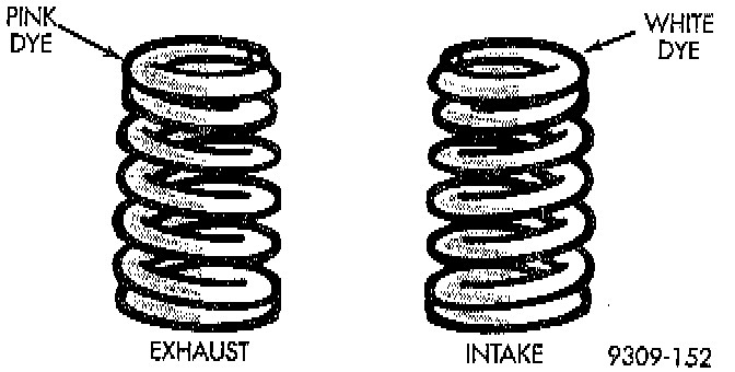 The valve springs are two different lengths and are wound in different directions. The valve springs are color coded, intake spring is right hand coil direction with white dye on the top coils and the exhaust spring is left hand coil direction with a pink dye on the top coils.