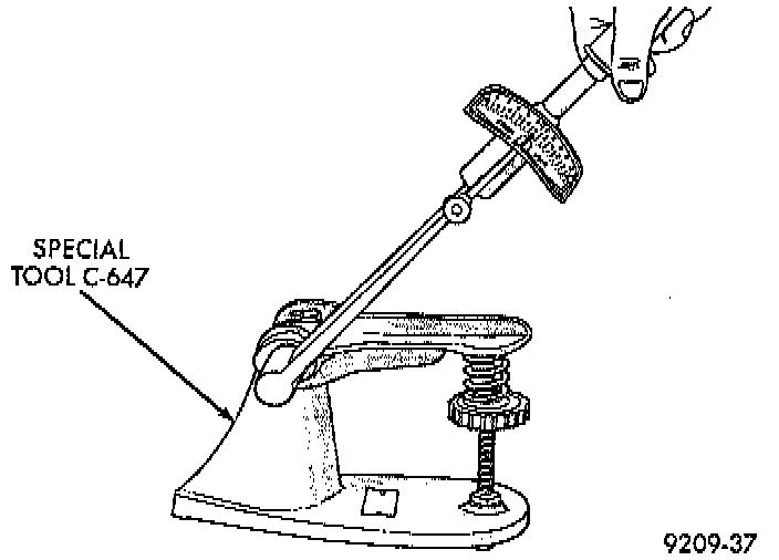 Whenever valves have been removed for inspection, reconditioning or replacement, valve springs should be tested. As an example; the compression length of the spring to be tested is 38.00 mm (1.496 inches). Turn table of Tool C-647, or equivalent until surface is in line with the 38.00 mm (1.496 inches) mark on the threaded stud and the zero mark on the front. Place spring over stud on the table and lift compressing lever to set tone device. Pull on torque wrench until ping is heard. Take reading on torque wrench at this instant. Multiply this reading by two. This will give the spring load at test length. Fractional measurements are indicated on the table for finer adjustments. Refer to Specifications to obtain specified height and allowable tensions. Discard the springs that do not meet specifications.