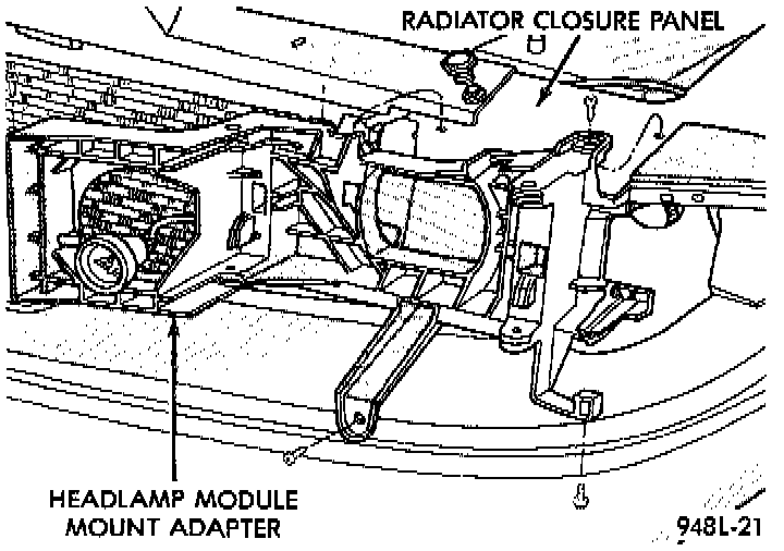 3. From behind front bumper fascia, remove bolts holding mount adapter to radiator closure panel.