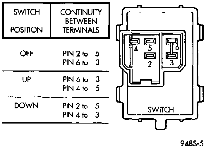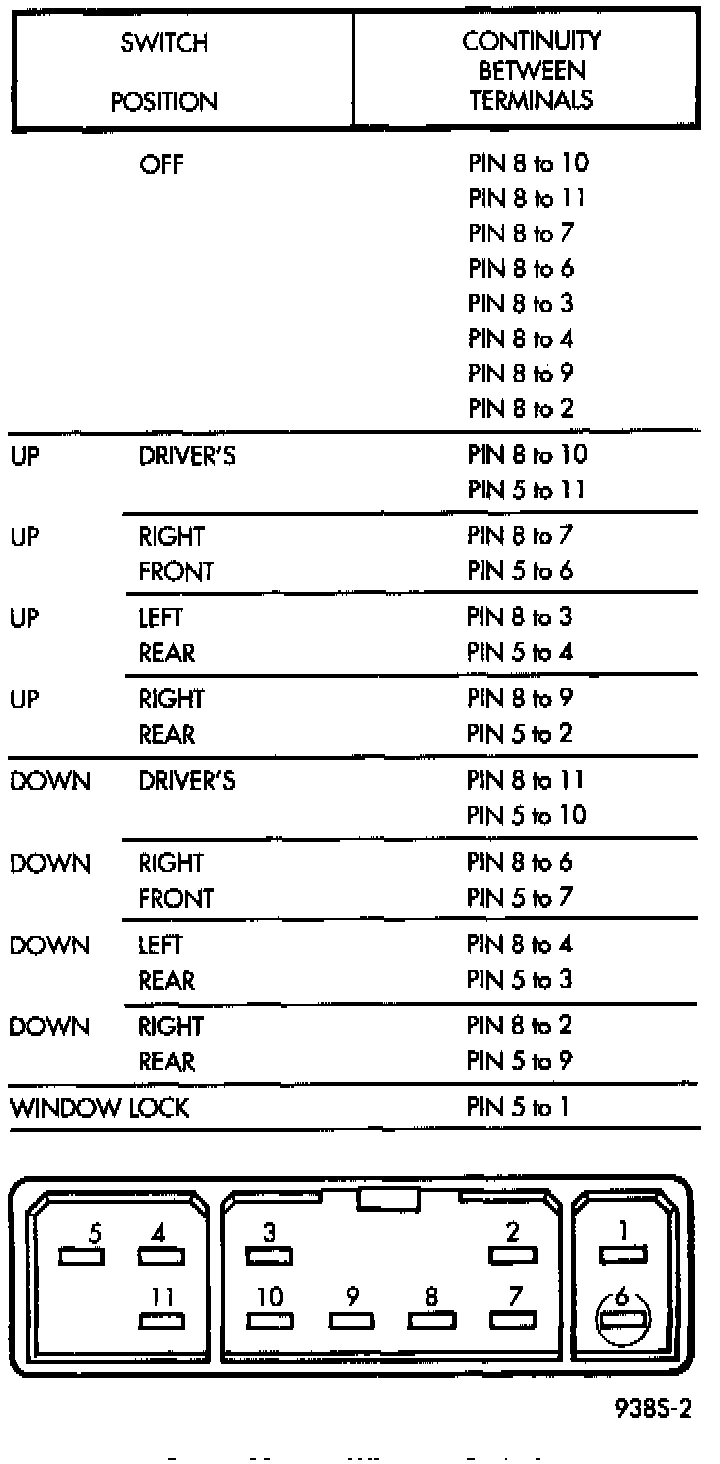 For switch testing, remove the switch from its mounting, refer to Switch Removal. Using an ohmmeter, refer to Window Switch Continuity Charts to determine if continuity is correct. If the results are not obtained, replace the switch.