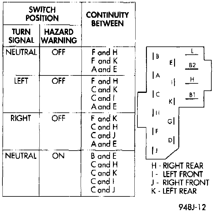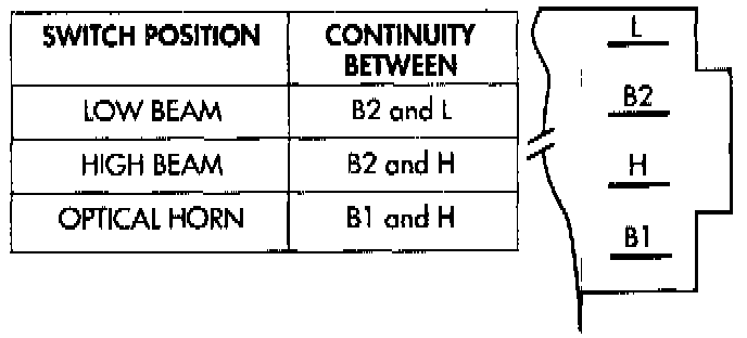 The multi-function switch contains electrical circuitry for turn signal, hazard warning, headlamp beam select, headlamp optical horn. This integrated switch assembly is mounted to the left hand side of the steering column. Should any function of the switch fail, the entire switch assembly must be replaced.Turn Signal And Hazard Switch Continuity: