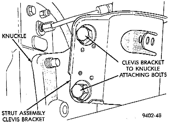 4. Loosen lower bolt attaching strut clevis bracket to steering knuckle or rear knuckle ONLY enough to allow knuckle to move in clevis bracket.