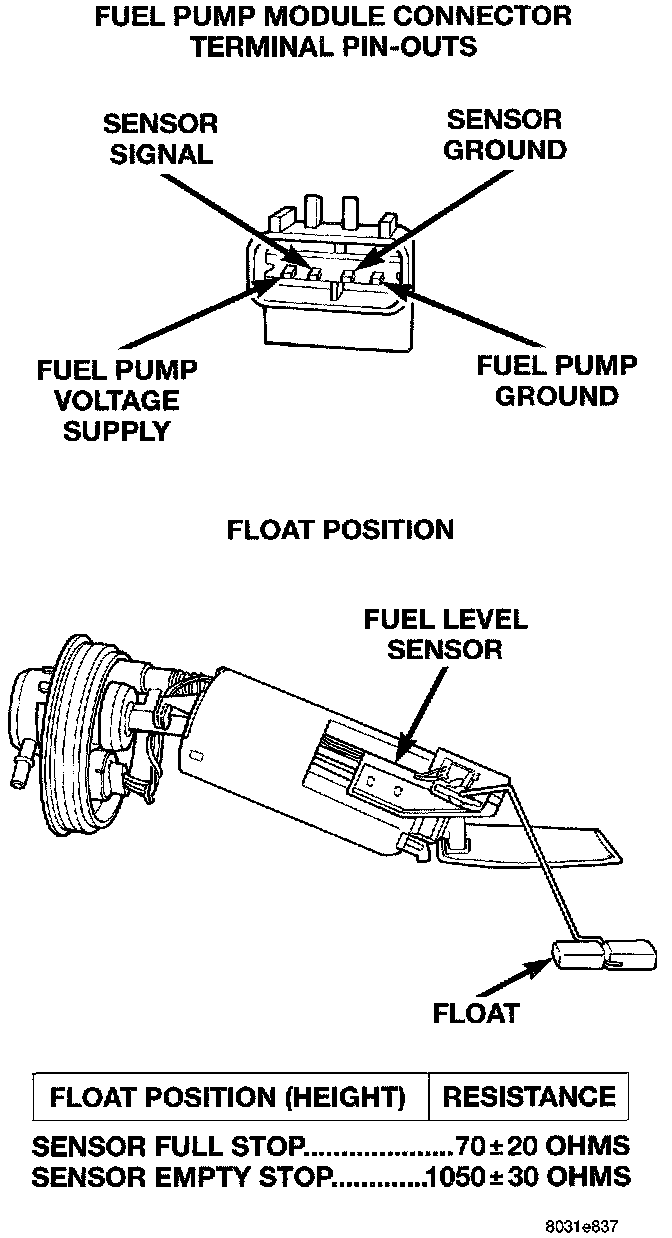 The fuel gauge sending unit is attached to the side of the fuel pump module. The sending unit consists of a float, an arm, and two variable resistors (tracks). These two tracks are used to send two different electrical signals. One is used for fuel gauge operation and the other is for OBD II emission requirements.