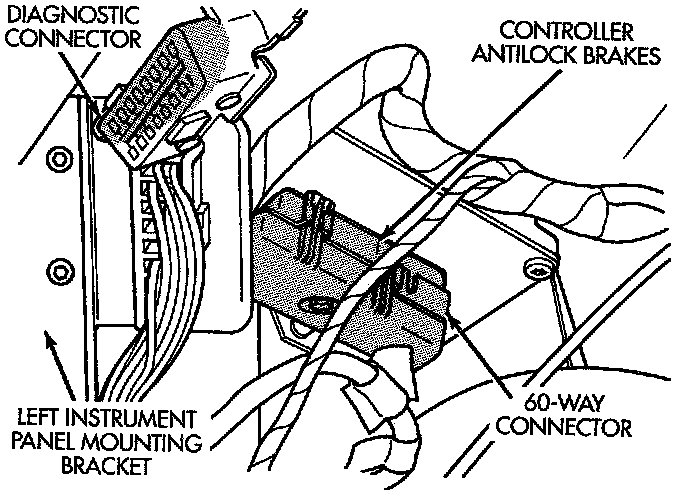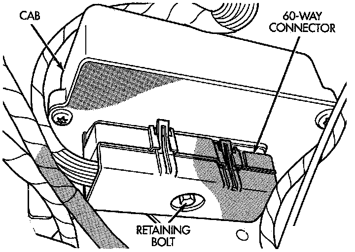 2. Disconnect the wiring harness 60 way connector from the Controller Antilock Brake Module (CAB). Verify that the vehicle ignition is off before removing the 60 way connector.