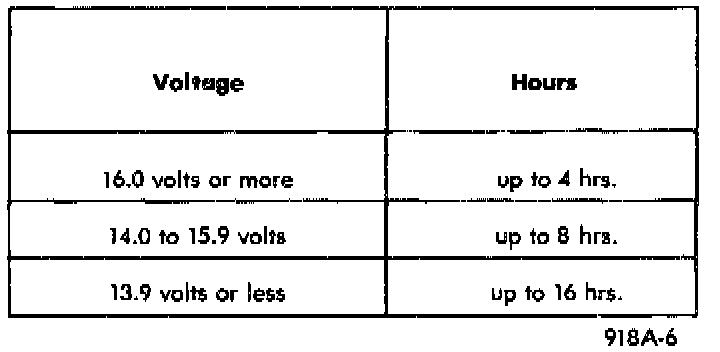 3. Battery chargers vary in the amount of voltage and current they provide. For the time required for the battery to accept measurable charger current at various voltages. If charge current is still not measurable after charging times, the battery should be replaced. If charge current is measurable during charging time, the battery may be good, and charging should be completed in the normal manner.
