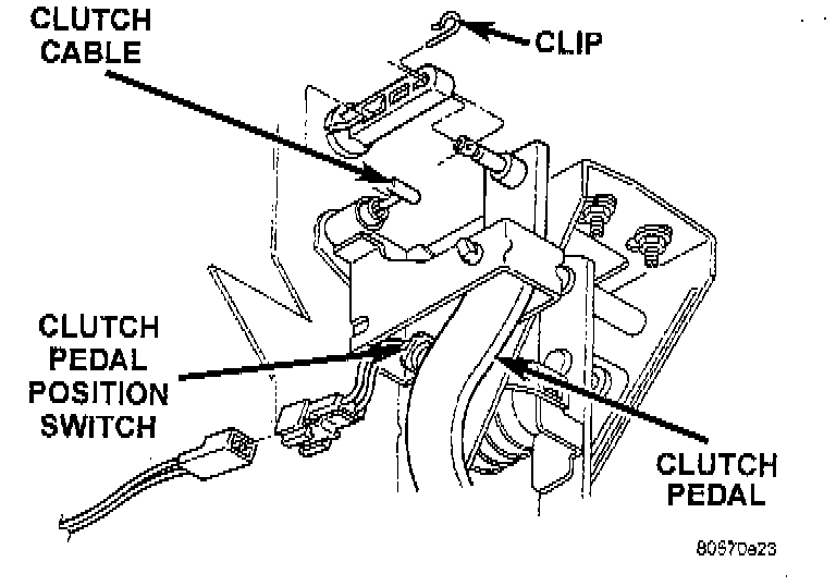 The clutch pedal position switch is mounted to a bracket located behind the clutch pedal. The switch is held in place by four plastic wing tabs.