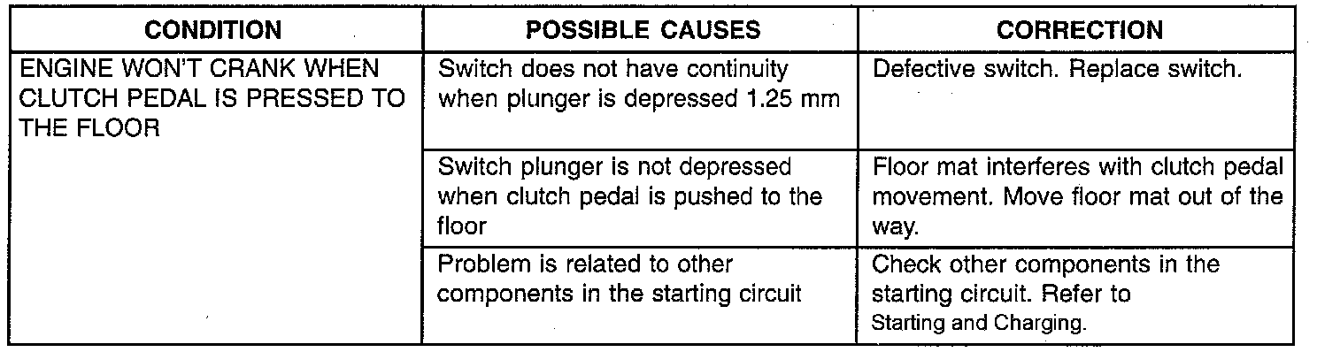 If vehicle will not crank, even with clutch pedal pressed to the floor, refer to illustrated chart.