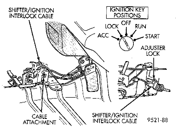 5. Pry up the adjuster lock on the shifter/ignition interlock cable. Unsnap the shifter/ignition interlock cable end fitting from the groove in the gearshift mechanism.