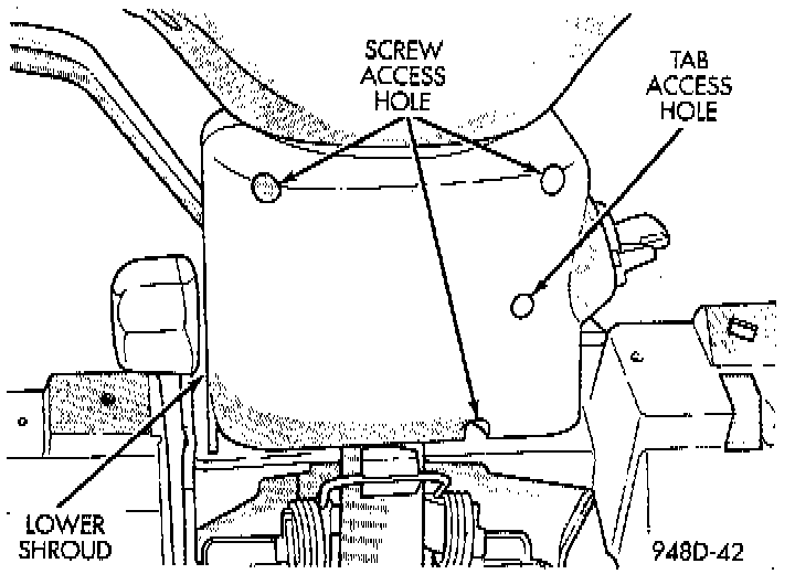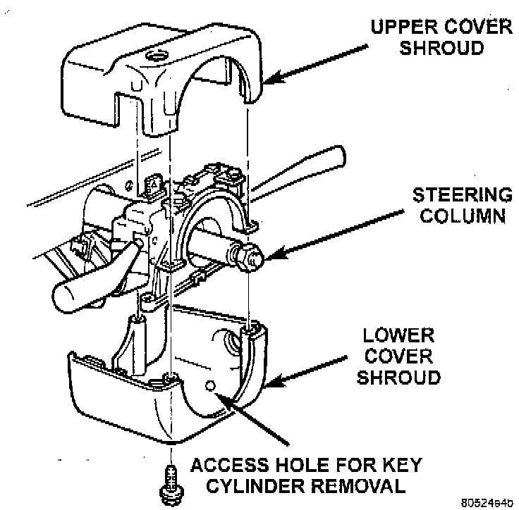 13. Insert a screwdriver into access hole in the lower shroud. Depress the cylinder button while rotating the cylinder with the key inserted between the ON and START positions. This will disengage the cylinder from the column.