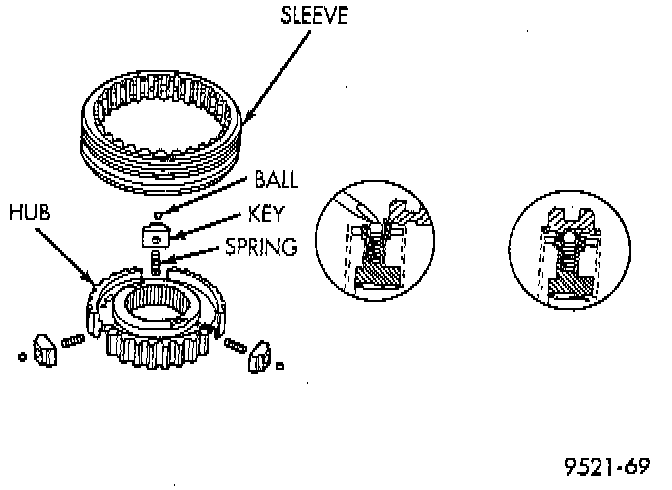 DISASSEMBLYPlace synchronizer in a clean shop towel and wrap. Press on inner hub. Carefully open up shop towel and remove springs, balls, keys, hub, and sleeve.