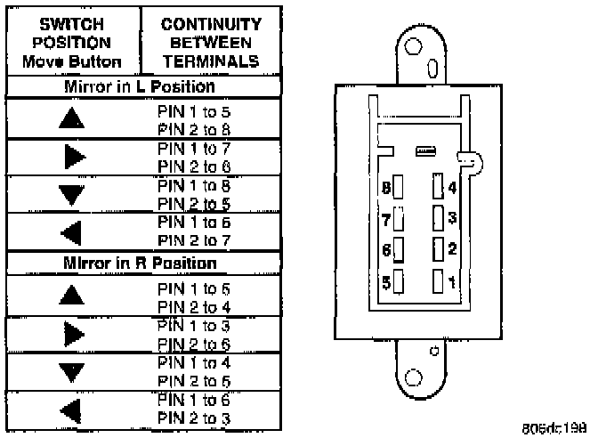3. Using an ohmmeter, test for continuity between the terminals of the switch as shown in the Mirror Switch Test.