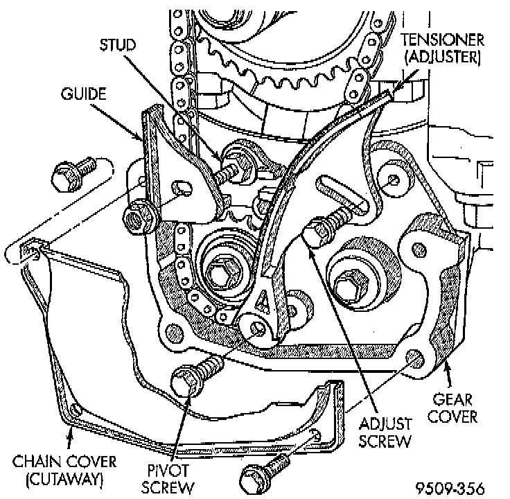 2. Loosen tensioner pivot and adjusting screws, move driven balance shaft inboard through driven chain sprocket. Sprocket will hang in lower chain loop.