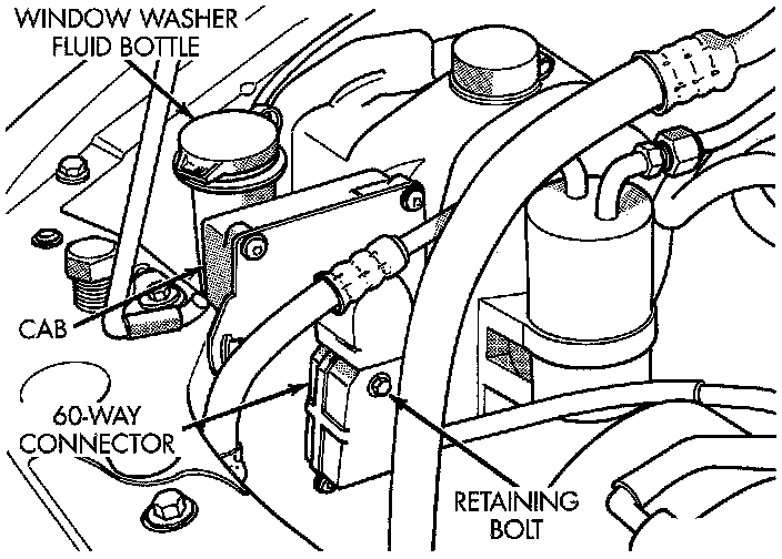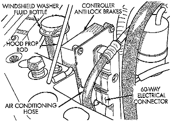 2. Disconnect the wiring harness 60 way connector from the Controller Antilock Brake Module (CAB). Verify that the vehicle ignition is off before removing the 60 way connector.