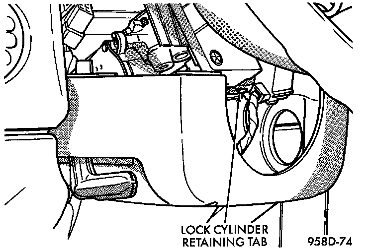 4. Place key cylinder in RUN position. Depress lock cylinder retaining tab and remove key cylinder.