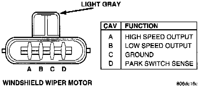 2. Using an ohmmeter, with the wiper motor in the PARK position, check for continuity between Pin C and Pin D on the wiper motor connector. If continuous continuity, go to Step 3. If not OK, replace motor.