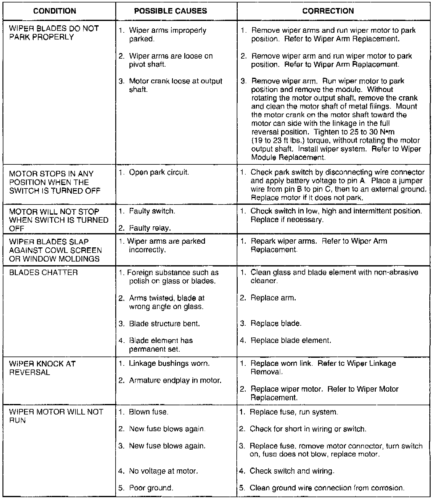 Whenever a wiper motor malfunction occurs, disconnect motor wire harness and clean the terminals. Ensure the wire harness is properly connected before starting diagnosis and repair procedures. Refer to Wiper Motor Test.