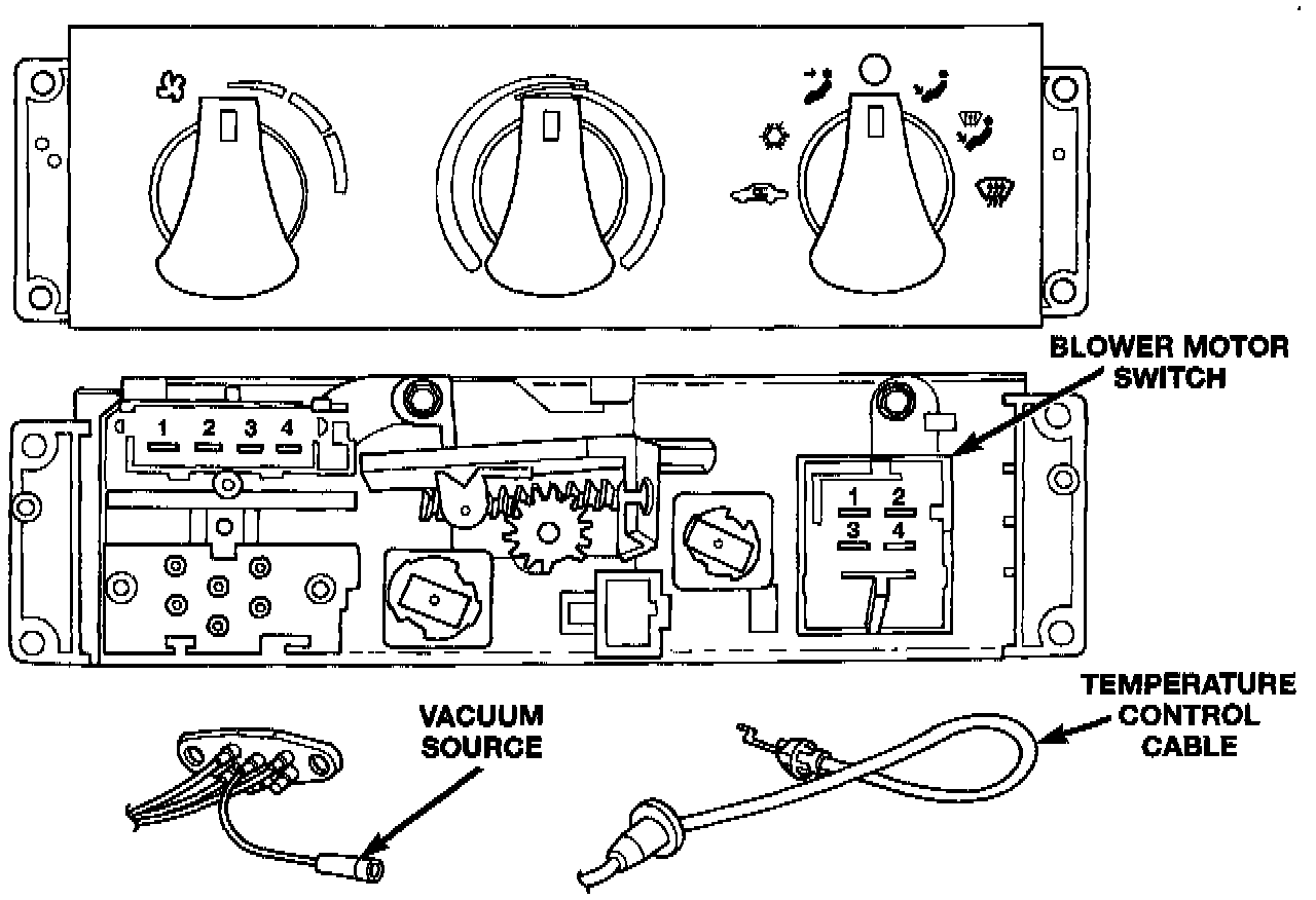 6. Remove screws and pull control assembly rearward. Reach behind control and disconnect the wire connectors, vacuum lines and temperature control cable and remove switch.