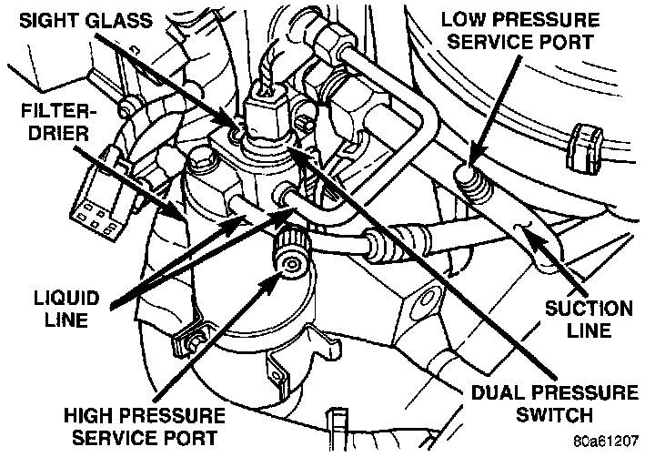 4. Remove the dual pressure switch connector located atop the filter-drier beside the cowl air inlet.