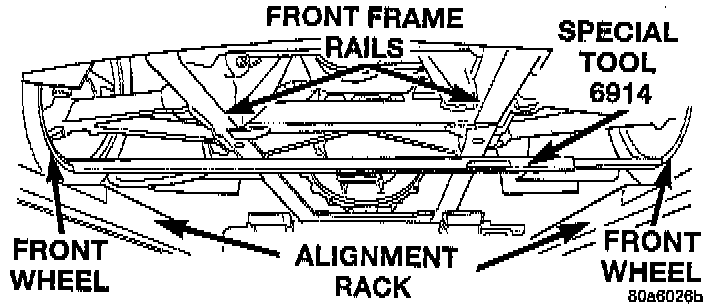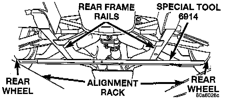 4. Refer to illustration to ensure that the Vehicle Height Checking Fixtures, Special Tool 6914, or equivalent are correctly attached to the inner flange of the front and rear wheels.