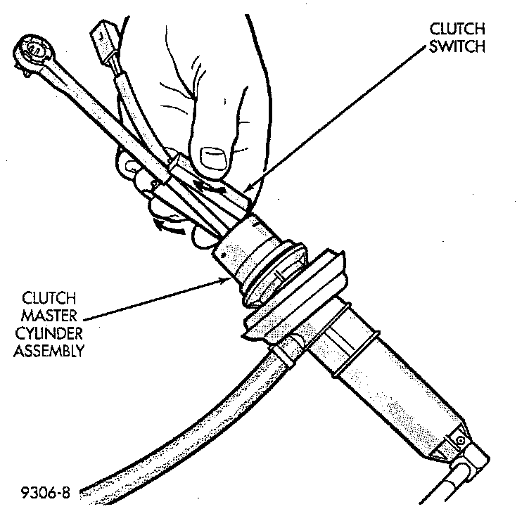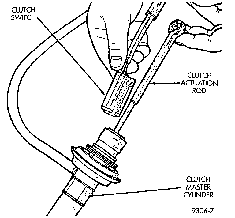 1. Install new switch as shown. Be sure that the spring loaded plunger inside the switch is slightly compressed. The plunger inside the switch must go on the narrow section of the clutch master cylinder actuation rod. Place the top of the switch against the rod. Then push the switch up slightly. This will compress the plunger. Then push the bottom of the switch against the rod. Failure to install the switch as described or forcing the switch onto the rod will crack the switch.