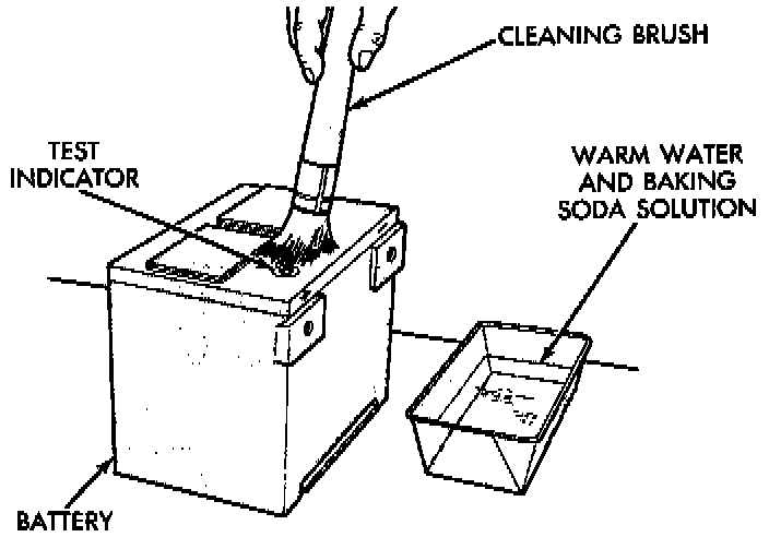 6. Clean battery with a solution of warm water and baking soda. Apply solution with a bristle brush and allow to soak until acid deposits loosen. Rinse with clear water and blot dry with paper toweling. Dispose of toweling in a safe manner. Refer to the WARNINGS on top of battery.