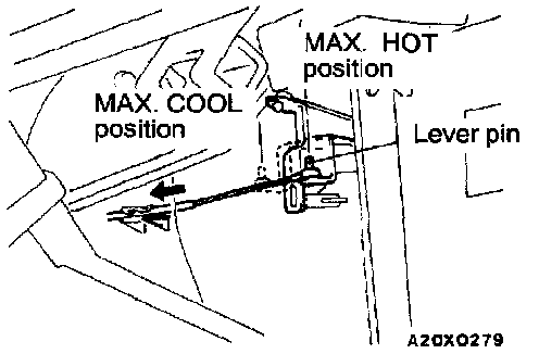 3. Set the air mix damper lever at the upper part of the heater unit to the MAX. HOT position, and install the cable to the lever pin.