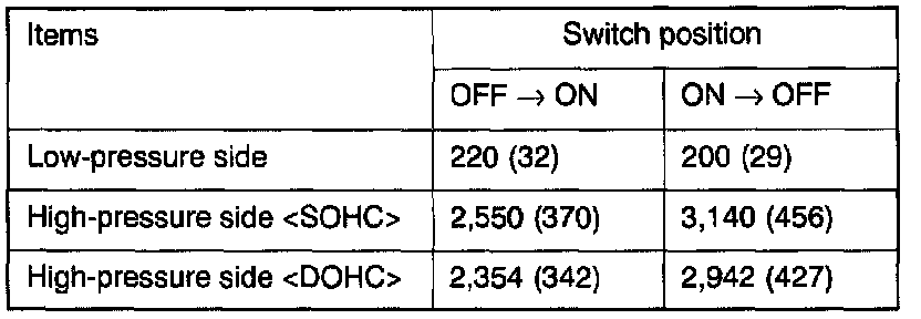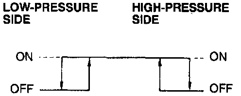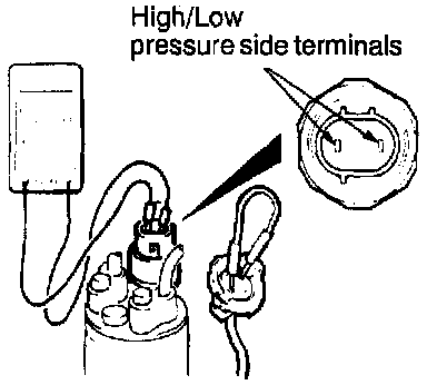 3. When the high/low pressure sides of the dual pressure switch are at operating pressure (ON) and there is continuity between the respective terminals, then the condition is normal. If there is no continuity, replace the switch.