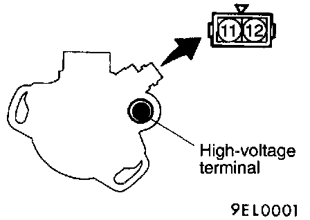 2. Measurement of the secondary coil resistance Measure the resistance between the high-voltage terminal and connector terminal 11.