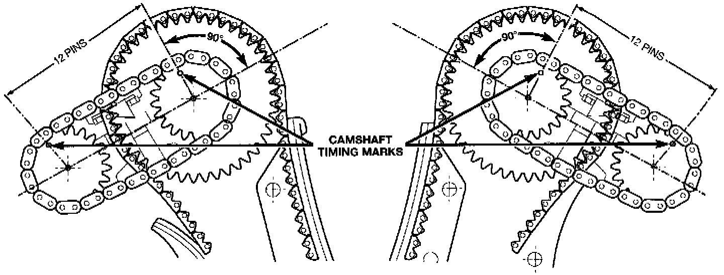 4. Count chain pins from the mark on the intake camshaft towards the exhaust camshaft. Engine is timed correctly when there are 12 chain pins between the timing marks on the intake camshaft and exhaust camshaft.