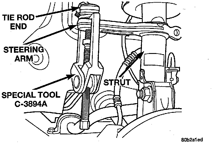 6. Loosen but do not remove the outer tie rod end attaching nut. Remove outer tie rod end from steering arm using Puller, Special Tool, C-3894A or equivalent.