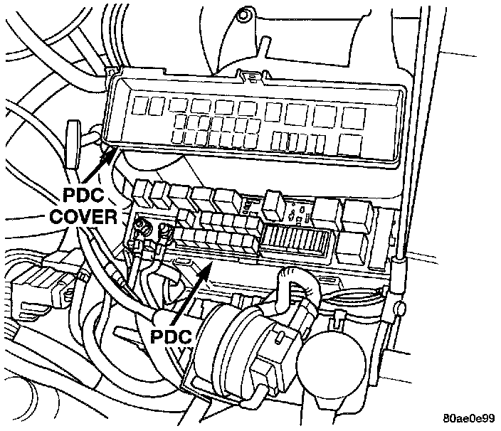 The ASD relay and fuel pump relay are located in the Power Distribution Center (PDC) near the battery (Fig. 8). A decal on the underside of the PDC cover shows the locations of each relay and fuse contained in the PDC.