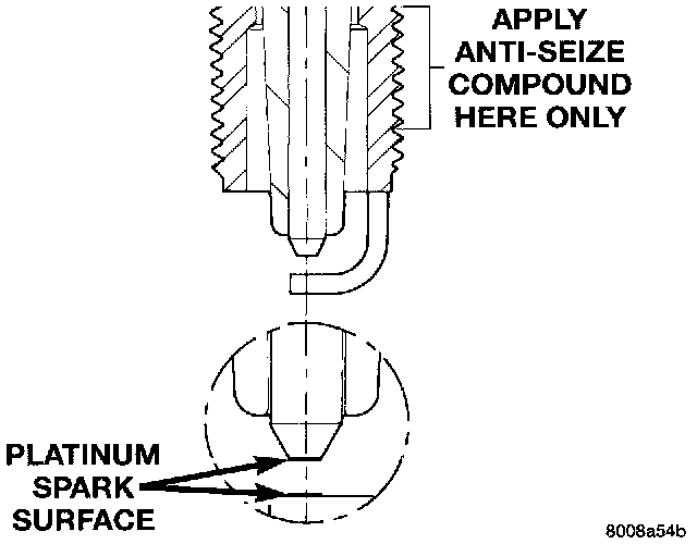 The spark plugs are double platinum and have a recommended service life of 100,000 miles for normal driving conditions, and a recommended service life of 75,000 miles for severe driving conditions. A thin platinum pad is welded to both electrode ends as show in (Fig. 3). Extreme care must be used to prevent spark plug cross threading, mis-gapping and ceramic insulator damage during plug removal and installation.