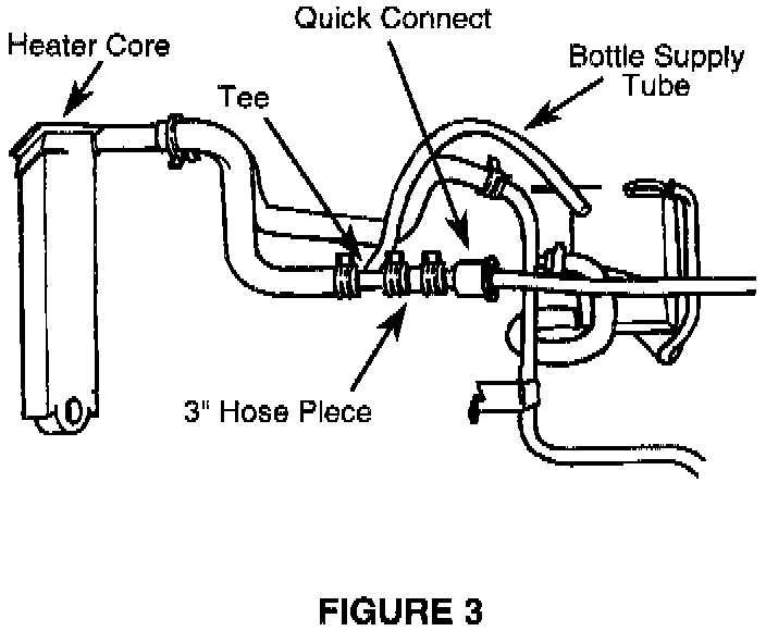 9. Install the remaining end of the 3/8 inch hose to the coolant pressure bottle. Use clamp p/n 04592126. The final heater hose configuration is shown in Figure 3.