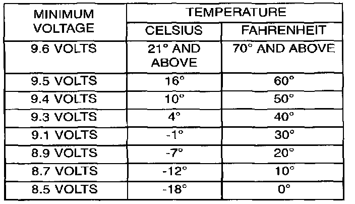 5. Voltage drop will vary according to battery temperature at the time of the load test. Battery temperature can be estimated by the temperature of exposure over the preceding several hours. If the battery has been charged or boosted a few minutes prior to the test, the battery would be slightly warmer. Refer to Load Test Temperature Chart for proper loaded voltage reading.
