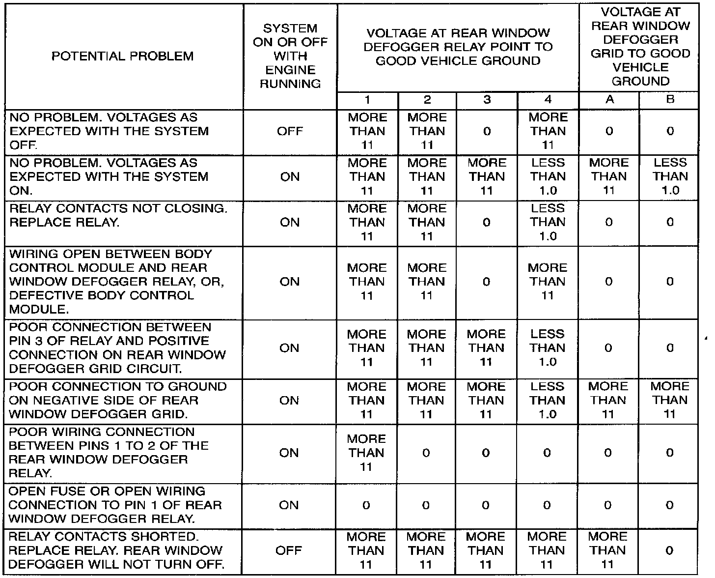 Check voltages at rear grid relay and refer to Rear Widow Defogger Relay Test table.