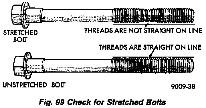 1. Check connecting rod bolts for necking by holding a scale or straight edge against the threads. If all threads do not contact the scale, the bolt should be replaced.