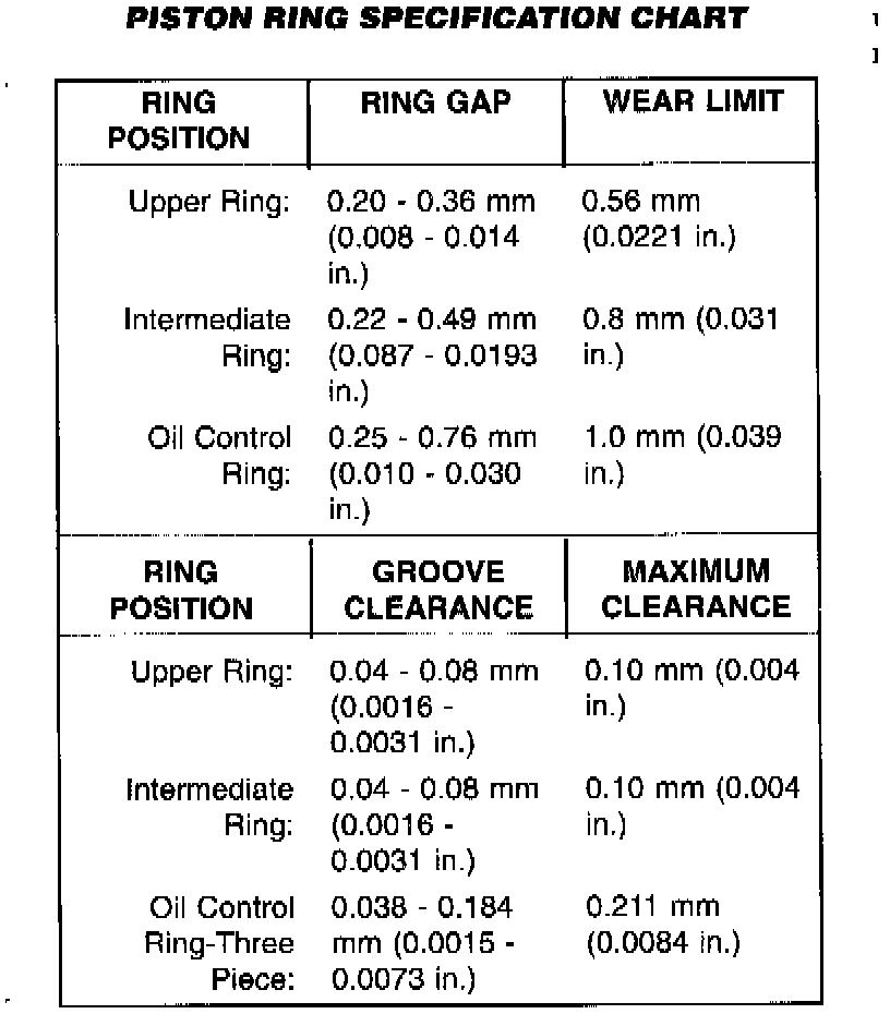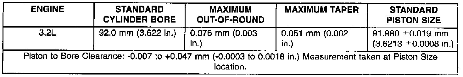 CYLINDER BORE AND PISTON SPECIFICATION CHART: