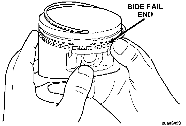 7. Install the side rail by placing one end between the piston ring groove and the expander. Hold end firmly and press down the portion to be installed until side rail is in position. Do not use a piston ring expander during this step.