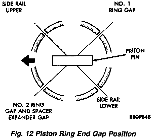 11. Position oil ring expander gap at least 45° from the side rail gaps but not on the piston pin center or on the thrust direction. Staggering ring gap is important for oil control.