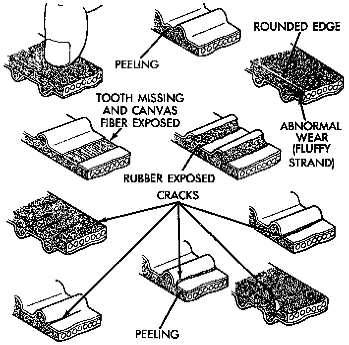 - Abnormal wear of belt sides. The sides are normal if they are sharp as if cut by a knife.