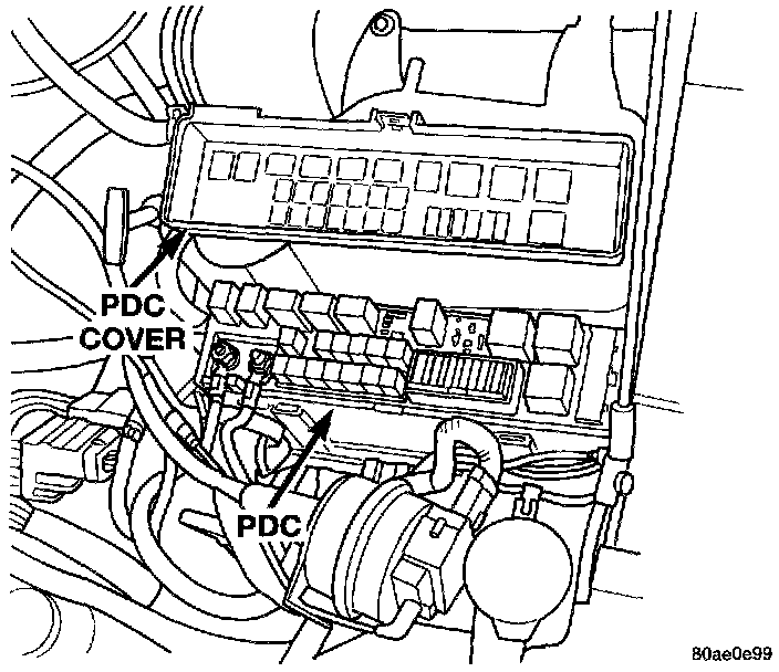 The A/C compressor clutch relay is located in the Power Distribution Center (PDC) (Fig. 20). A decal on the inside of the PDC covers shows the locations of each relay and fuse contained in the PDC.